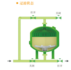 当系统处于过滤状态时,加压水从滤罐进口流入布水系统,均匀的到达滤料层。当水流过滤料层时,悬浮物被滤料截留。过滤器底部有带缝隙的集水器,过滤后的干净水被均匀收集,并流出过滤器。