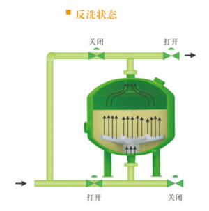 随时杂质在滤料层中不断聚积,压力损失不断增加,当压差增加到某一设定值时或到达设定的清洗时,系统将自动转换至反洗状态。加压水通过集水装置进入滤料层,对其进行冲刷,使截留的污染物脱落并排出过滤系统。反洗持续至少2分钟后,阀门自动将系统转至过滤状态。